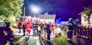 Als die Feuerwehr eintraf, schlugen die Flammen aus dem Dachgeschoß und aus dem Fenster der Wohnung. Zunächst wurde wegen Einsturzgefahr ein Außenangriff mit mehreren C- Rohren vorgenommen. Er als wenige Brandlast war, gingen die Feuerwehrleute mit schwerem Atemschutz über die Treppe und Leitern in das Innere vor.