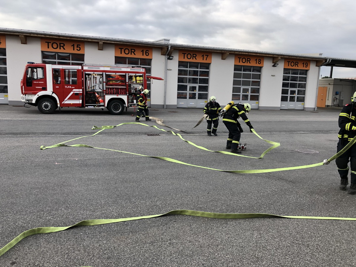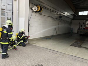 Um 10 Uhr ging’s für alle Feuerwehren dann gemeinsam weiter: Übungsannahme war ein Brandausbruch im Veranstaltungsstadl Grafenwörth, drei Personen werden vermisst. Die Einsatzleitung vor Ort übernahm die Feuerwehr Jettsdorf, den ersten Angriff führte eine kombinierte Crew aus Feuersbrunn und Jettsdorf, kurz danach traf auch das gemischte Team aus Wagram und Grafenwörth ein und nahm eine zweite Löschleitung in das Objekt vor. Das von zahlreichen Festen bestens bekannte Objekt „kann ja kein Problem“ sein, dacht man sich. Jedoch hatte die Übungsleitung innen kräftig „umgebaut“ und inkl. Verrauchung ein komplett neues Szenario erschaffen – eine Herausforderung! Auch eine Druckbelüftung wurde aufgebaut und eine Kommunikationsstruktur etabliert. Schon 30min später hieß es auch hier „Brand aus“.