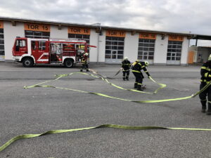 Bereits vorab bekannt war bloß die grobe Stoßrichtung „Brandeinsatzübung, Rufbereitschaft um 8 Uhr im Feuerwehrhaus“. Nicht einmal eine Minute später verwarf die Übungsleitung dann jede Vorausplanung aufgrund der stark ungleichmäßigen Teilnehmerverteilung und man tat, was die Feuerwehr am besten kann: Improvisieren!