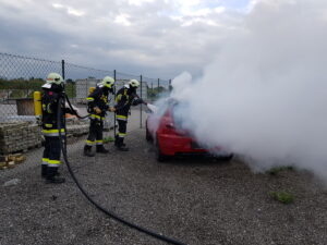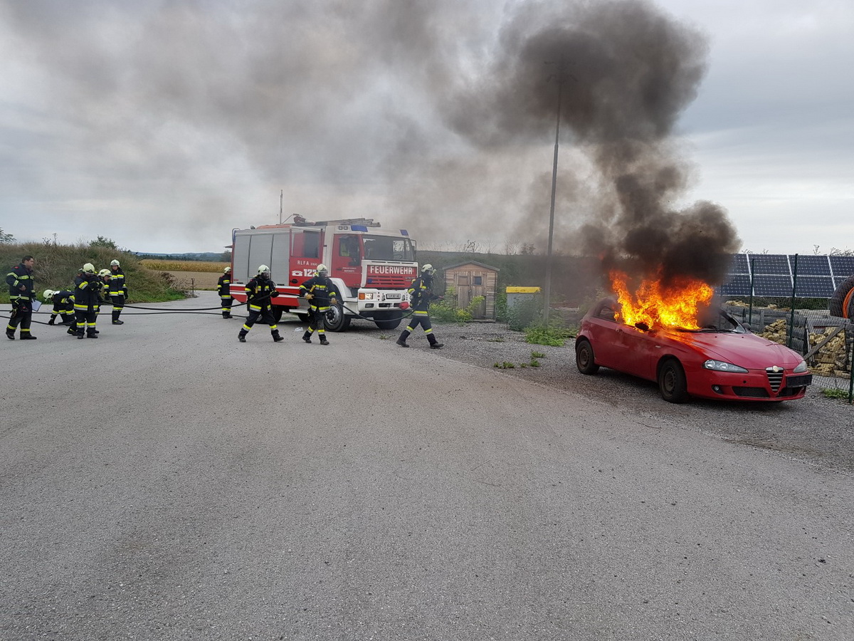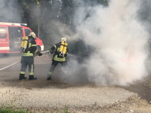 Ähnlich überrascht wurden wohl die Kameraden der Feuerwehr Wagram: Der erste Übungsbefehl lautete nach Grafenwörth abzurücken und das eigene Kleinlöschfahrzeug gegen das „ausgewachsene“ Rüstlöschfahrzeug aus Grafenwörth zu tauschen um einen simulierten Fahrzeugbrand in Seebarn anzugreifen. Die Überraschung währte jedoch nur kurz: Viele Jahre des gemeinsamen Trainings von der Grundausbildung bis zum Löscheinsatztraining machten sich nun bezahlt. Binnen weniger Minuten war der Fahrzeugbrand unter Kontrolle und schon ging’s weiter.