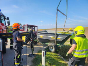 Um eine rasche und sichere Bergung zu gewährleisten, wurde die FF Großweikersdorf mit dem Wechselladefahrzeug samt Kran zur Unterstützung angefordert. In enger Zusammenarbeit der beiden Feuerwehren konnte der Anhänger mithilfe von Seilwinde und Kran behutsam geborgen und wieder auf festen Untergrund gebracht werden.
