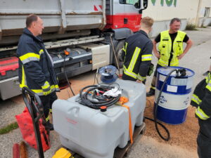 „Mittels Treibstoffpumpe der Feuerwehr, welche zur Ausrüstung für den Großstromerzeuger gehört, konnte dann der restliche Diesel, ca. 200 Liter, in ein passendes Fass umgepumpt werden. Dadurch konnte eine Gefährdung für die Umwelt erfolgreich verhindert werden!“, erklärte Feuerwehr-Pressesprecher Manfred Ploiner.