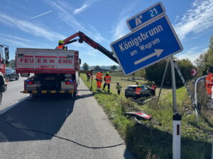 Viel zu tun gab es bei der Feuerwehr Grafenwörth am 04.10.2025. Während des laufenden Maschinistenkurses und den Vorbereitungen zum abendlichen Helferessen platzte eine Alarmierung zu einem Verkehrsunfall auf der S5 bei Königsbrunn herein. Dort hatte ein Lenker die Kontrolle über sein Fahrzeug verloren und war in das Schild der Abfahrt gekracht.