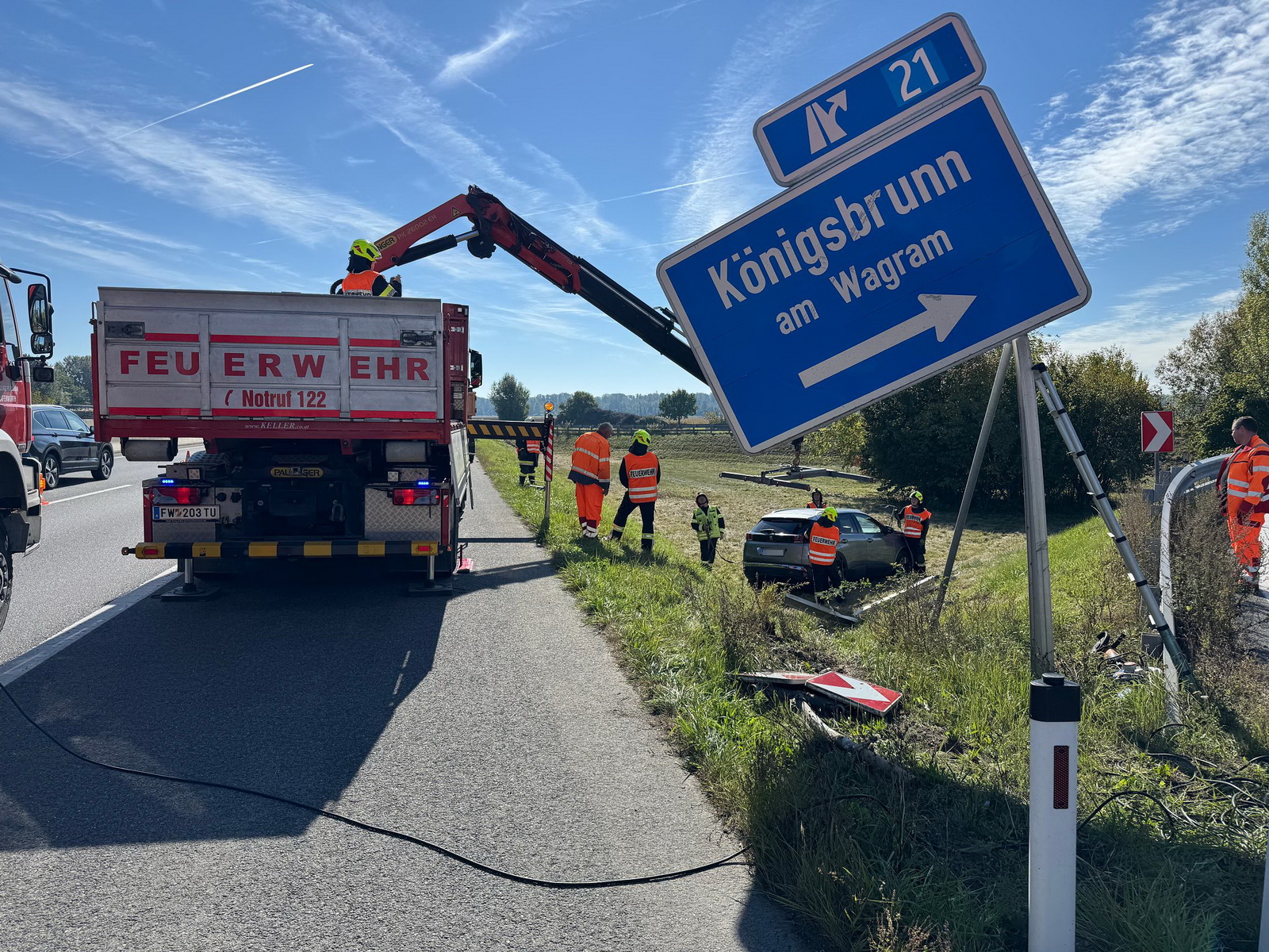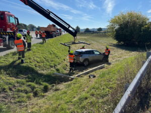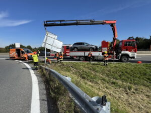 Wie durch ein Wunder wurde der Lenker dabei nicht verletzt, sein Fahrzeug jedoch schwer beschädigt, weshalb von der Autobahnpolizei die Feuerwehr angefordert wurde. Vor Ort sicherten die Grafenwörther die Unfallstelle gemeinsam mit der ASFINAG-Autobahnmeisterei ab und begannen unmittelbar mit der Fahrzeugbergung. Per Kran des Wechselladefahrzeuges war dies auch rasch erledigt.