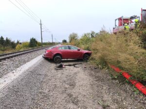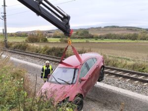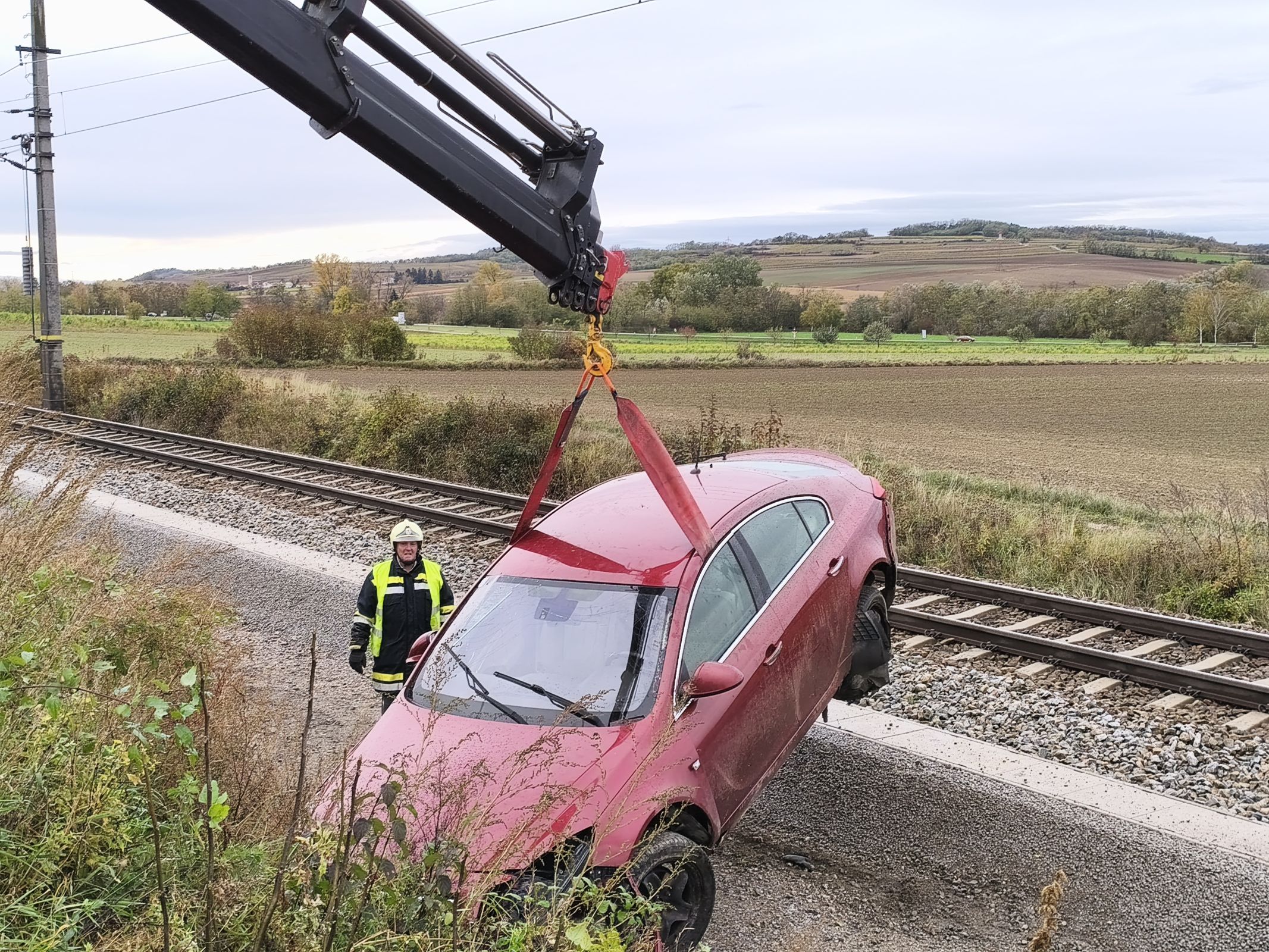 Ein Opel war im Bereich des Bahnbegleitwegs zwischen Baumgarten am Wagram und Großweikersdorf, nahe der Landesstraße L2166, von der Fahrbahn abgekommen und eine Böschung hinabgerutscht. Das Fahrzeug kam zwischen der Böschung und dem Bahndamm zum Stillstand.