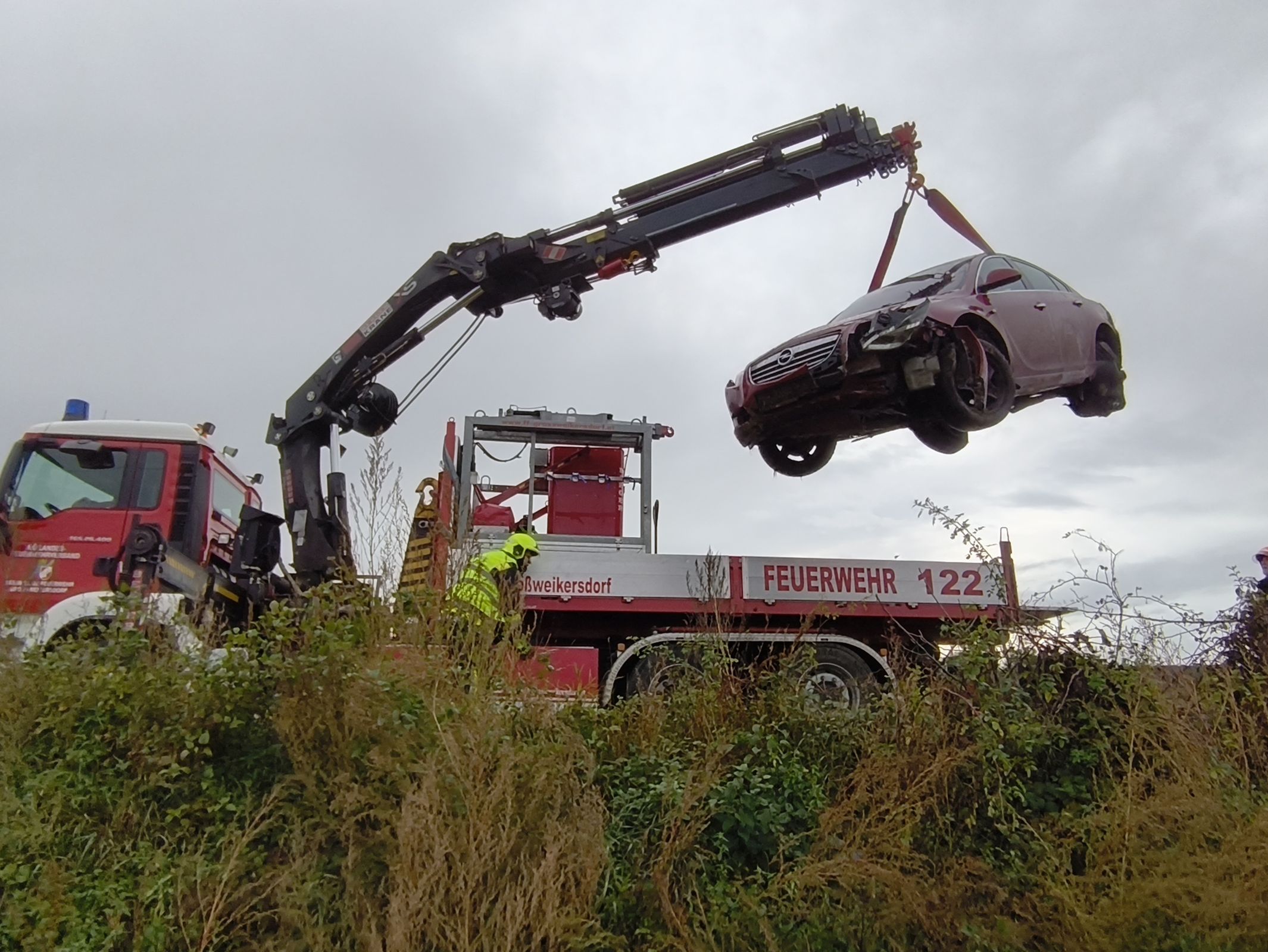 Das Fahrzeug wurde mithilfe eines Krans geborgen und anschließend gesichert abgestellt.