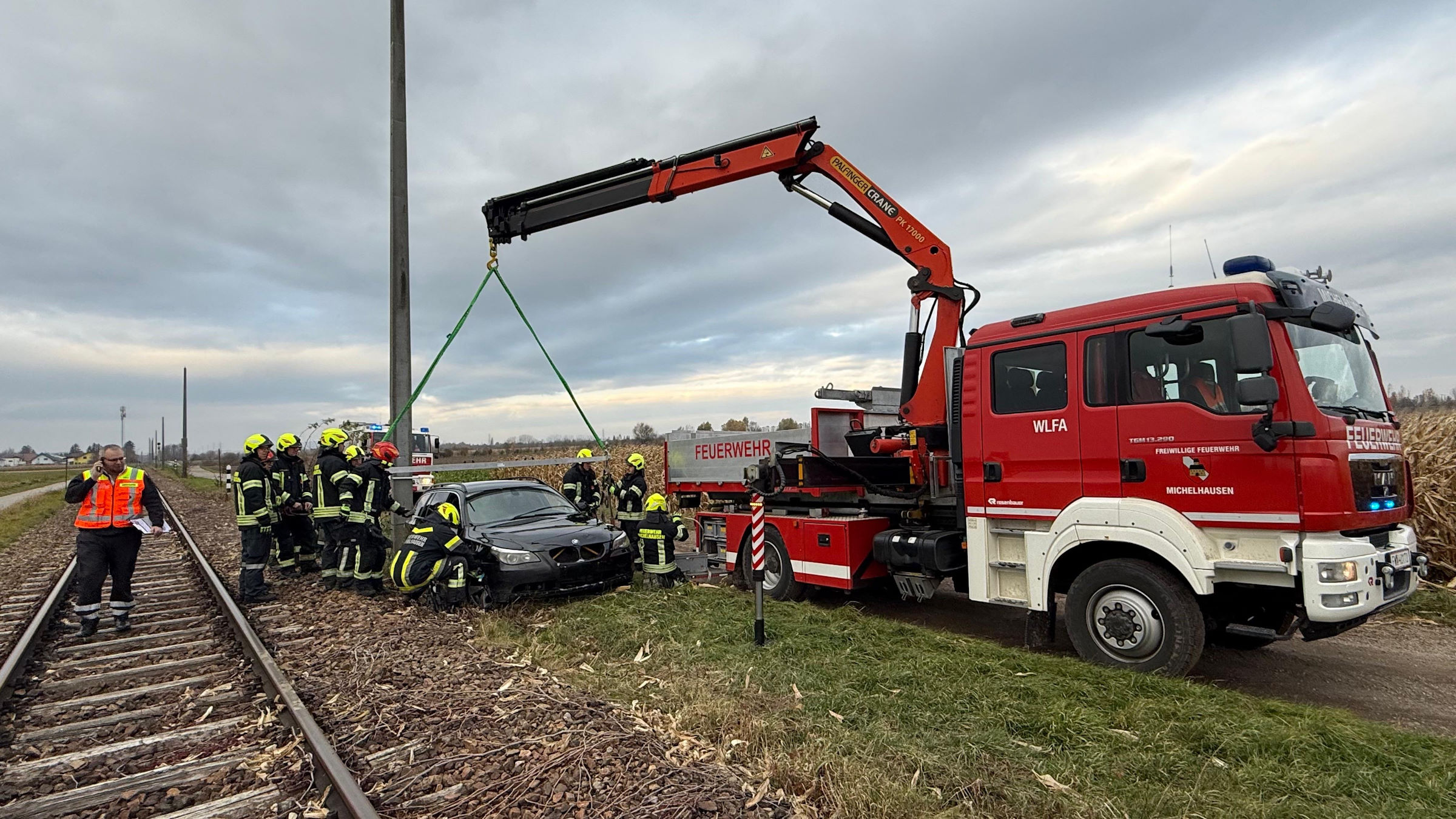 Bereits am darauffolgenden Tag, dem 9. November, wurde die FF Michelhausen kurz nach 8 Uhr zu einer Fahrzeugbergung alarmiert. Auf dem Güterweg zwischen Michelhausen und Atzelsdorf war ein Pkw ohne Kennzeichen auf den Gleisen der alten Franz-Josefs-Bahn entdeckt worden. Die Feuerwehr rückte mit RLFA und WLFA zum Einsatz aus. Beim Eintreffen waren die Polizei sowie der Einsatzleiter der ÖBB bereits vor Ort. Nach Rücksprache wurde das Fahrzeug mithilfe eines Krans geborgen und gesichert am angrenzenden Wiesenstreifen abgestellt.