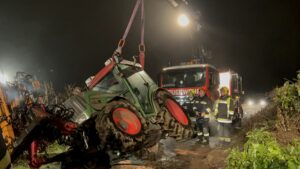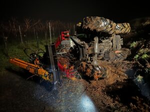 Beim Eintreffen der Einsatzkräfte bestätigte sich die Meldung: Ein Traktor war im Weinberg zwischen Großwiesendorf und Rupperthal rund zwei Meter abgestürzt. Der Fahrer blieb glücklicherweise unverletzt. Mit Hilfe eines Krans konnte die Arbeitsmaschine wieder aufgerichtet werden. Um mögliche Umweltschäden zu verhindern, wurde der Traktor mit einer Plane gegen auslaufende Betriebsmittel gesichert. Das Fahrzeug verblieb anschließend im Weingarten und wurde am darauffolgenden Tag vom Landwirt selbst abtransportiert.