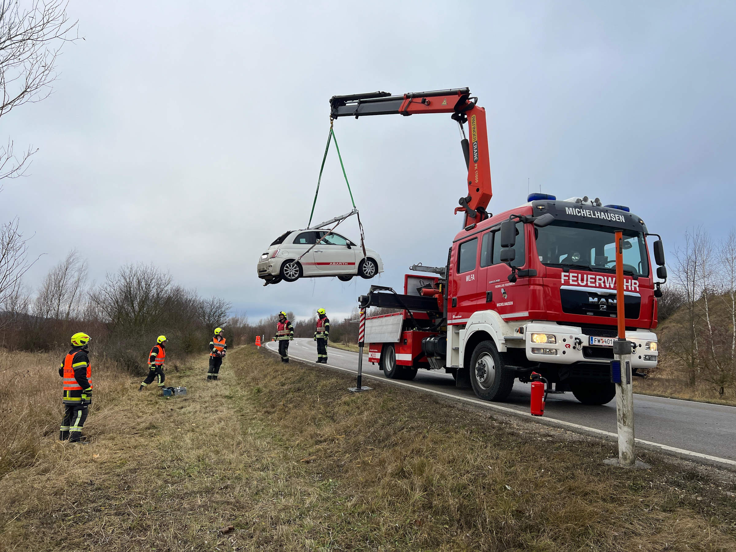Am Sonntag, dem 21. Dezember wurde die FF Michelhausen kurz vor 10 Uhr zu einer Fahrzeugbergung alarmiert. Auf der L2090, auf Höhe des Tunnelportales, war eine Lenkerin mit ihrem Pkw von der Fahrbahn abgekommen. Das Fahrzeug überschlug sich dabei und kam kurz vor einem Wassergraben zum Stillstand. Die FF Michelhausen rückte mit KDOF, RLFA und WLFA mit Kran zu dem Einsatz aus. Nach der Ankunft wurde die Einsatzstelle sofort abgesichert und der Rettungsdienst nach alarmiert. Von diesem wurde die Lenkerin anschließend zur Kontrolle in das Krankenhaus gebracht. Nach der Unfallaufnahme wurde das Auto mittels Seilwinde näher zur Fahrbahn gezogen und schließlich mit dem Kran geborgen. Danach konnte die Fahrbahn wieder für den Verkehr frei gegeben werden.
