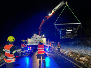 Um 2:42 Uhr wurde die FF Michelhausen am 28. Dezember, zu einer Fahrzeugbergung auf der Landesstraße 118 zwischen Pixendorf und Judenau alarmiert. Ein Fahrzeug war von der Fahrbahn abgekommen und im Entwässerungsgraben neben der Straße gelandet. Die Feuerwehr rückte mit KDOF, RLFA und WLFA mit Kran zu dem Einsatz aus. Bei Ankunft war die Polizei bereits vor Ort. Von den Einsatzkräften wurde zuerst die Einsatzstelle abgesichert und die Lage erkundet. Glücklicherweise wurde bei dem Unfall niemand verletzt. Nach der Freigabe durch die Polizei, konnte die Feuerwehr das Fahrzeug bergen. Dafür musste dieses zuerst einseitig angehoben und ausgerichtet werden, um weitere Beschädigungen zu vermeiden. Danach konnte das Auto auf dem WLFA verladen und in Pixendorf gesichert abstellen, wo es vom Pannendienst abgeholt wird.