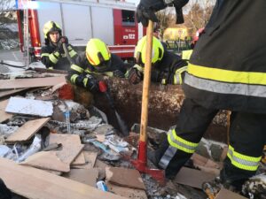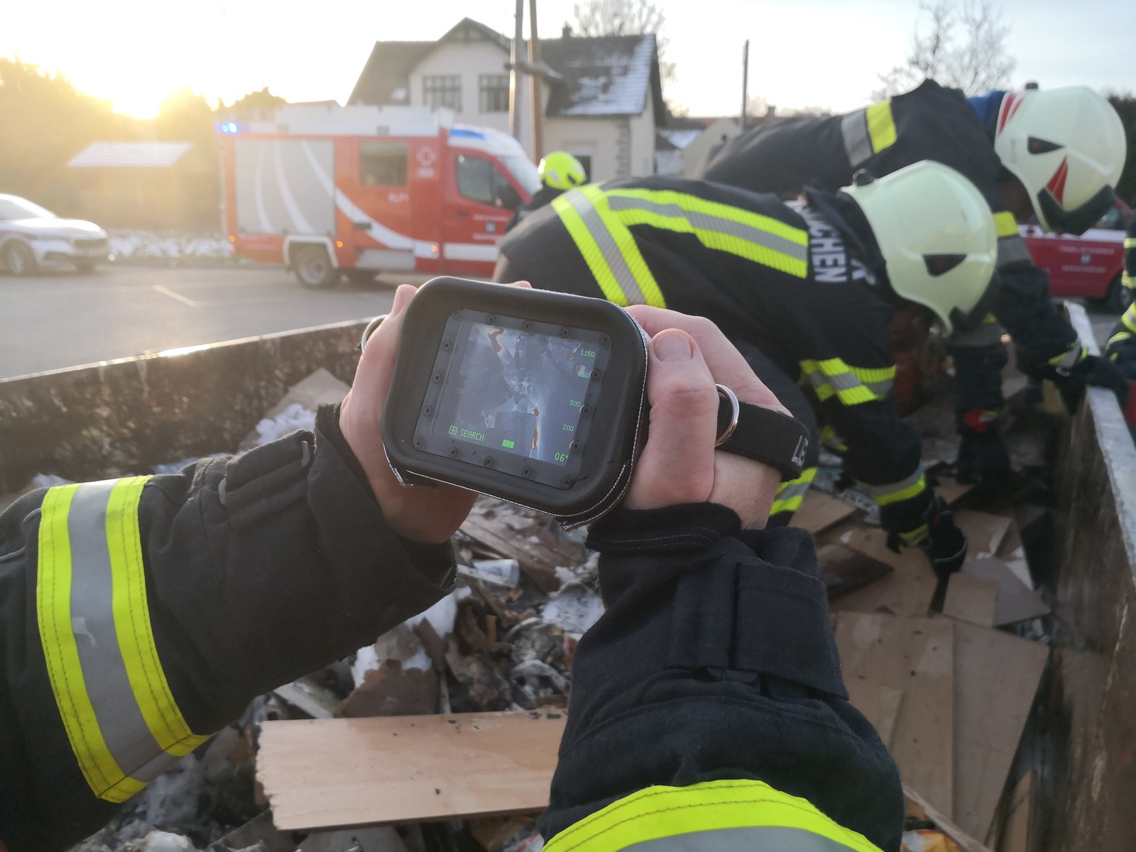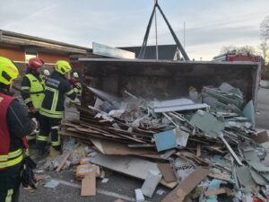 Seitens der Feuerwehr wurde durch das RLF sofort eine Löschleitung vorgenommen, um die Flammen abzulöschen. Gemeinsam mit der Mannschaft des HLF wurden Teile des Bauschutts ausgeräumt, um weiter zum Brandherd vordringen zu können. Da durch das manuelle Ausräumen nicht alle Bereiche erreicht werden konnten, und noch immer wärmere Stellen mit der Wärmebildkamera detektiert werden konnten bzw. Rauch wahrnehmbar war, musste die Mulde mit Hilfe des WLF umgekippt werden. Der nun locker liegende Bauschutt konnte von allen Seiten bis auf den Grund der Mulde abgelöscht werden, um eine mögliche Wiederentzündung effektiv zu verhindern.