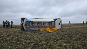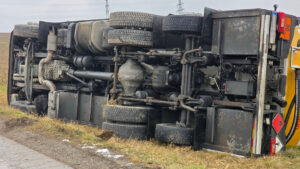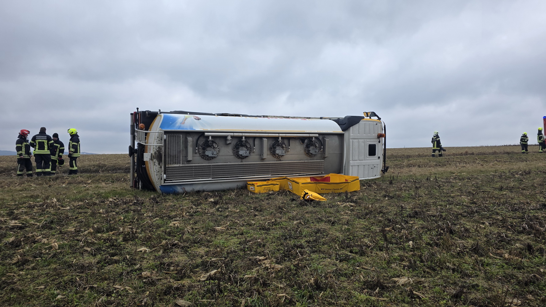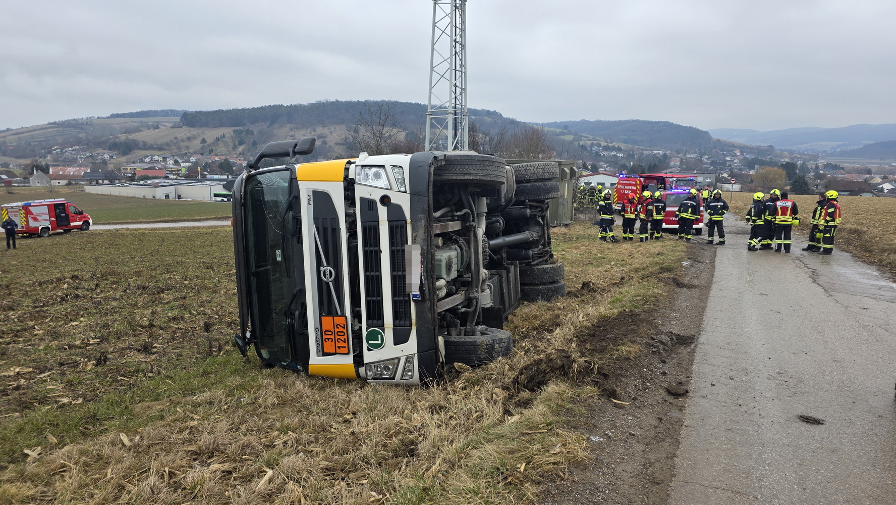 Aus bislang ungeklärter Ursache kam ein Lastkraftwagen von der Fahrbahn ab, geriet auf das Straßenbankett und kippte in weiterer Folge auf die Seite. Das Fahrzeug blieb schließlich seitlich in einem angrenzenden Feld liegen.