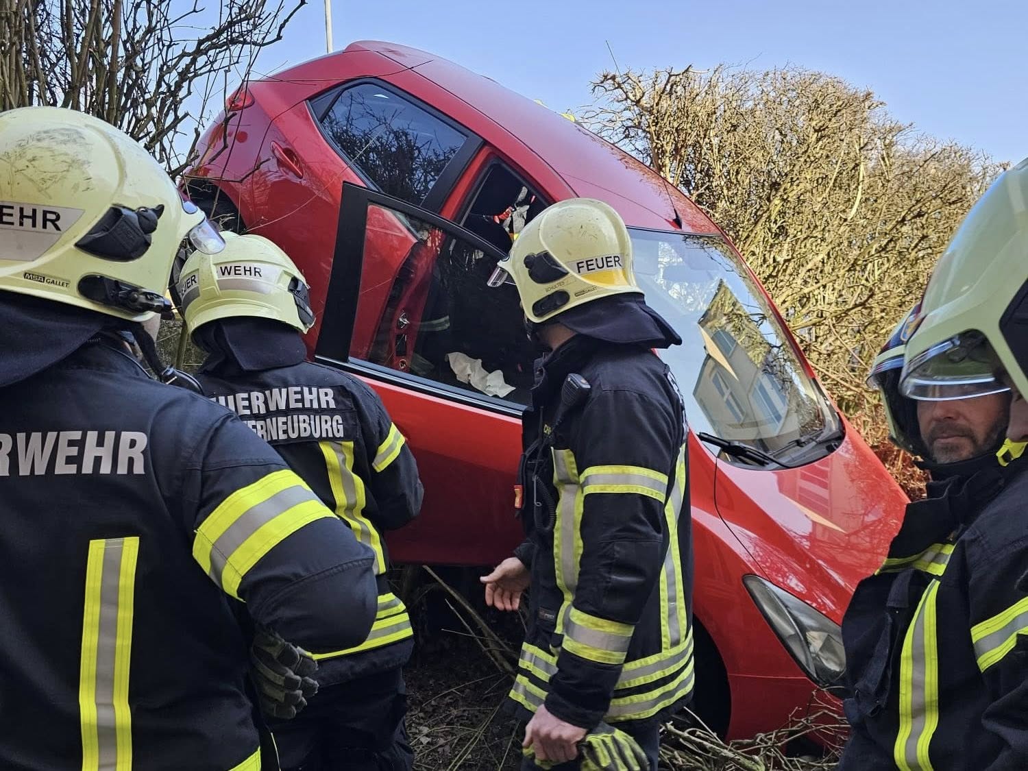 Am Donnerstag, den 05. März gegen 12:28 Uhr wurden beide Wachen der Feuerwehr Klosterneuburg zu einem Verkehrsunfall mit einer eingeschlossenen Person alarmiert. In der Käferkreuzgasse kam es aus bisher unbekannter Ursache beim einparken zu einem Missgeschick bei dem ein Pkw über die Parkplatzkante und im Anschluss in die Böschung hinunter rutschte. Einer Person konnte durch die Einsatzkräfte aus dem Fahrzeug befreit werden und wurde im Anschluss an das Rote Kreuz übergeben. Der Pkw wurde mit dem Kran geborgen und konnte am Parkplatz gesichert abgestellt werden. Nach einer Stunde konnte der Einsatz beendet werden.