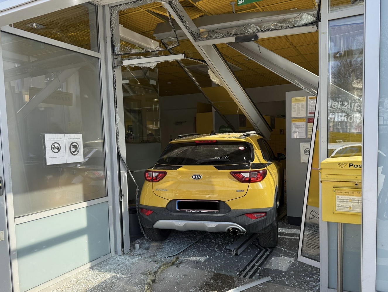 Aus bisher unbekannter Ursache durchbrach ein Pkw die Schiebetüre einer Postfiliale und kam im Eingangsbereich zum Stillstand. Der Lenker wurde vom Roten Kreuz vor Ort erstversorgt.