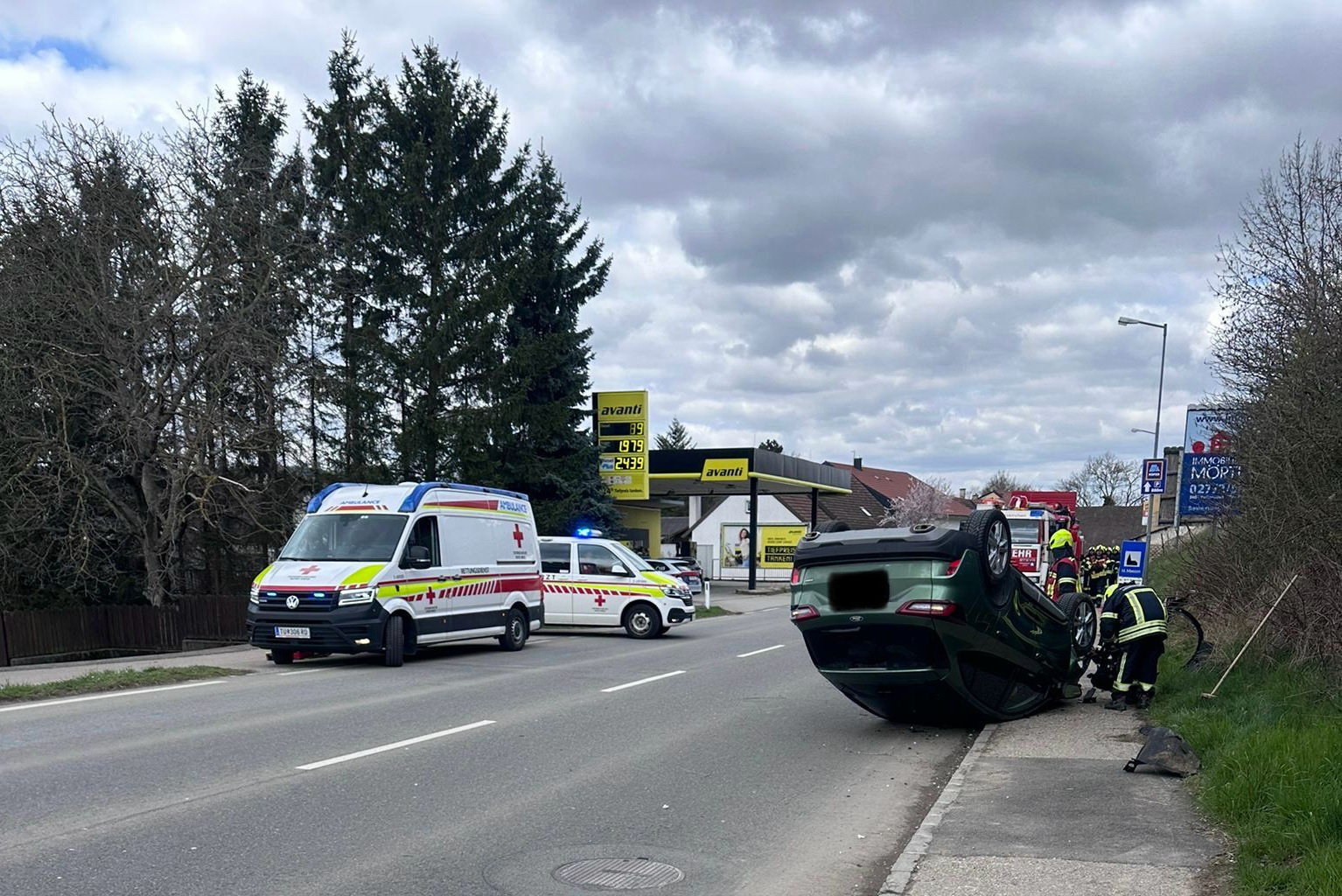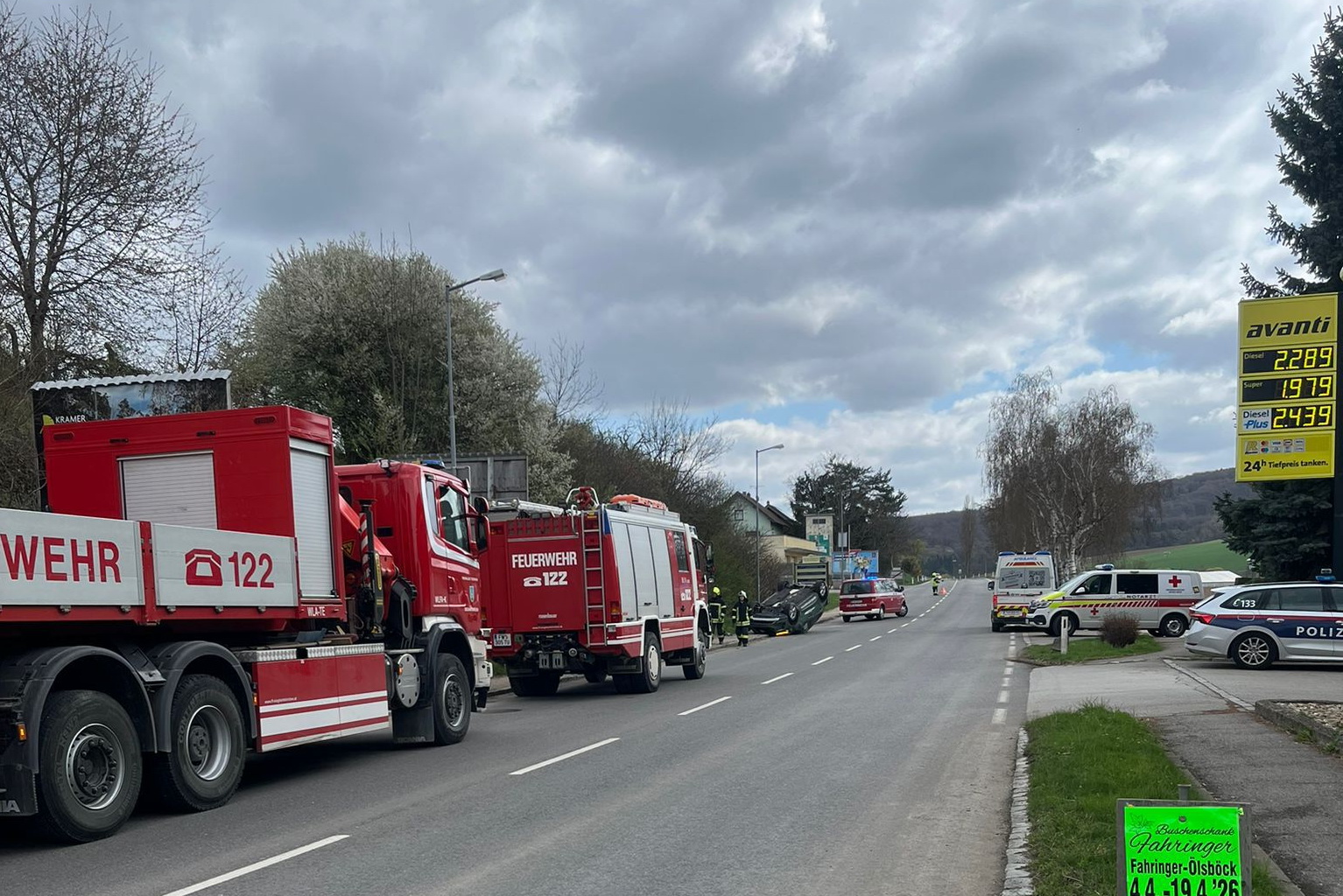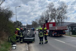 Nur einen Tag später, am Mittwoch, dem 1. April, folgte um 12:08 Uhr der nächste Einsatz an nahezu gleicher Stelle. Ein Pkw war von der Fahrbahn abgekommen, hatte sich überschlagen und kam auf dem Dach zum Liegen. Der Lenker wurde dabei unbestimmten Grades verletzt. Die Feuerwehr stellte das Fahrzeug mithilfe eines Krans wieder auf die Räder und sorgte anschließend für die Sicherung des Unfallwagens.