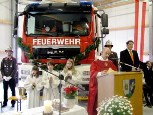 Der Einladung zur Florianimesse mit Fahrzeugsegnung des neuen Mannschafttransport-fahrzeuges Allrad (MTFA) folgten zahlreiche Ehrengäste, Feuerwehrkameradinnen...